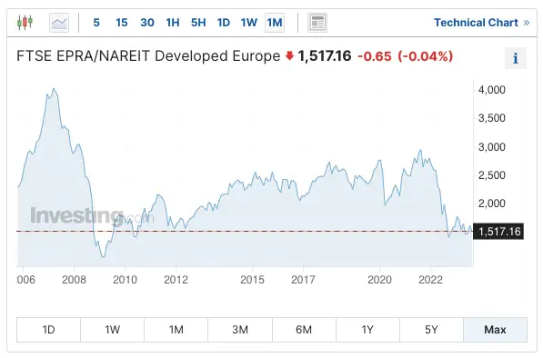 L’indice ci-dessous pris pour l’exemple est un indice répliquant le comportement boursier des principaux REITs en Europe (une moyenne montrant l’Etat global du marché).