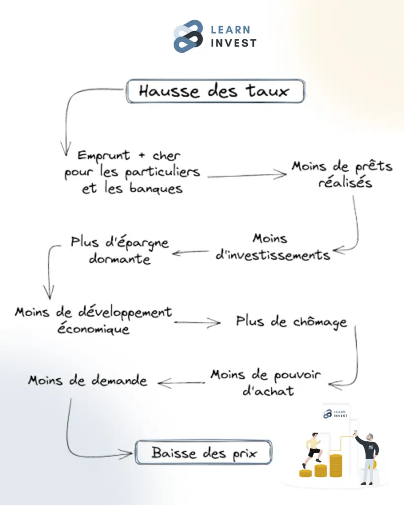 J’ai d’ailleurs partagé ce schéma sur Linkedin il y a quelques semaines qui explique pourquoi la hausse des taux implique à terme une baisse des prix !